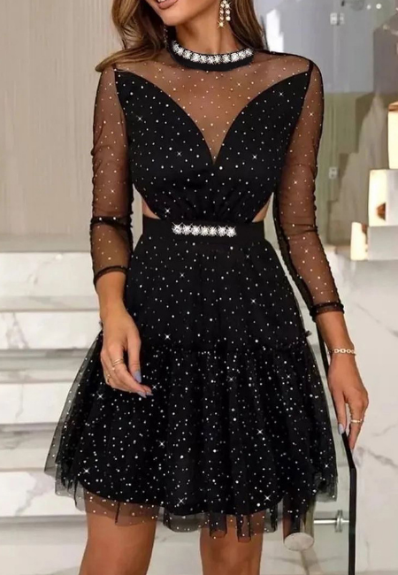 Black Mesh Beads Spliced Long Sleeved Dress