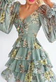 Black V-Neck Mesh Spliced Long Sleeved Dress