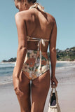 Fashion Multicolor Flower Print Crisscross Bandage Halter High Waist Bikini Set Swimsuit Swimwear
