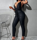 Casual Black V-Neck Stitching Long Sleeve Jumpsuit