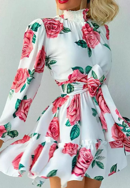 • Elegant Women'S Rose Printed Ruffled Dress