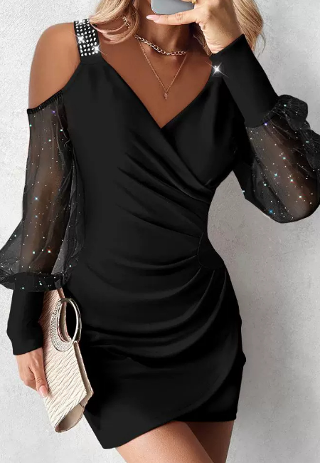 Black V-Neck Mesh Spliced Long Sleeved Dress