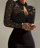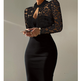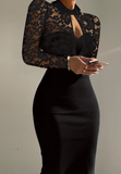 Black V-Neck Mesh Spliced Long Sleeved Dress