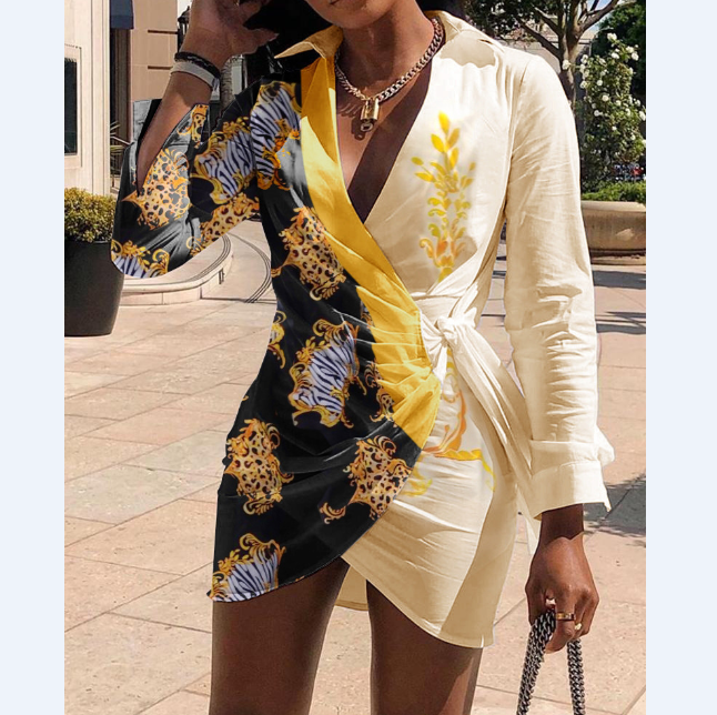 • Sexy Print Stitching Long Sleeve High Waist Dress