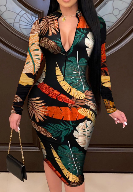• Sexy V-Neck Long Sleeve printed dress