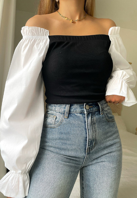 • Long Sleeve Black Splicing A Single Collar Casual Top