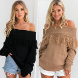 Autumn and winter fashion one word shoulder color pure tassel loose sweater long sleeves women