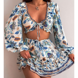 Floral Long-Sleeve High-Neck Skinny Two-piece Set