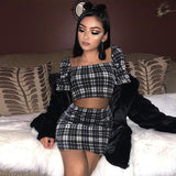 Women Fashion Multicolor Tartan Short Sleeve Square Neck Crop Tops Tight Package hip Skirt Casual Set Two-Piece