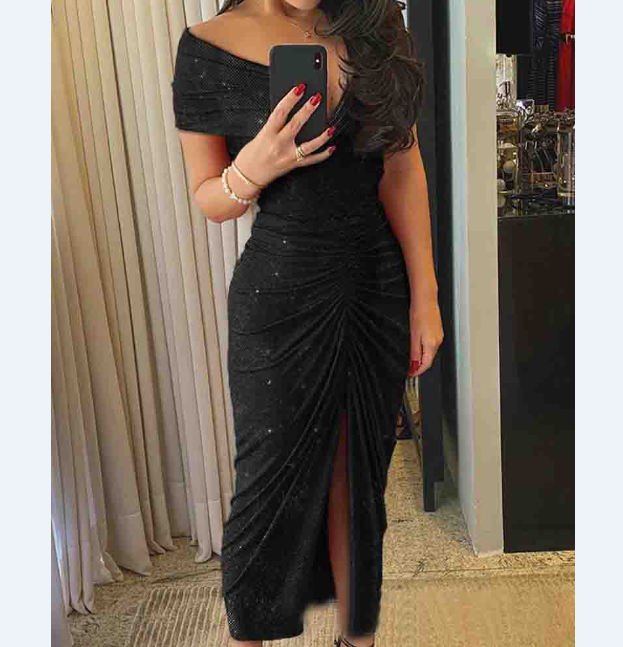 • Solid Color V-Neck Split Short Sleeve Dress