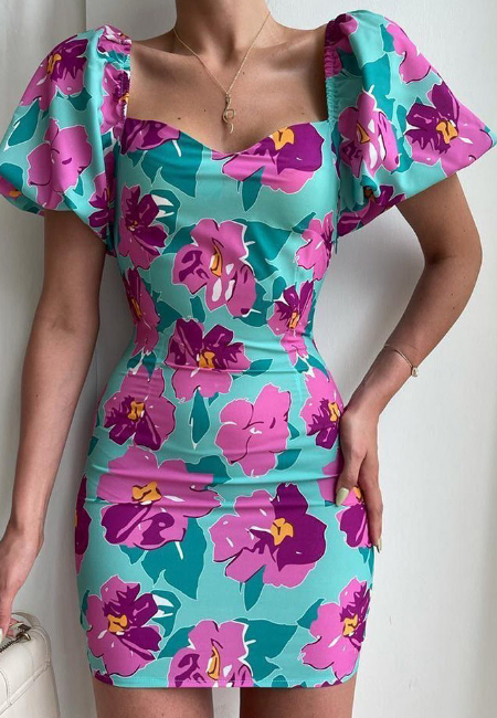 Women's Floral Puff Sleeve Skinny Pack Hip Dress