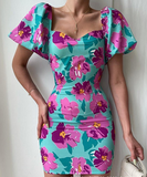 • Women's Floral Puff Sleeve Skinny Pack Hip Dress